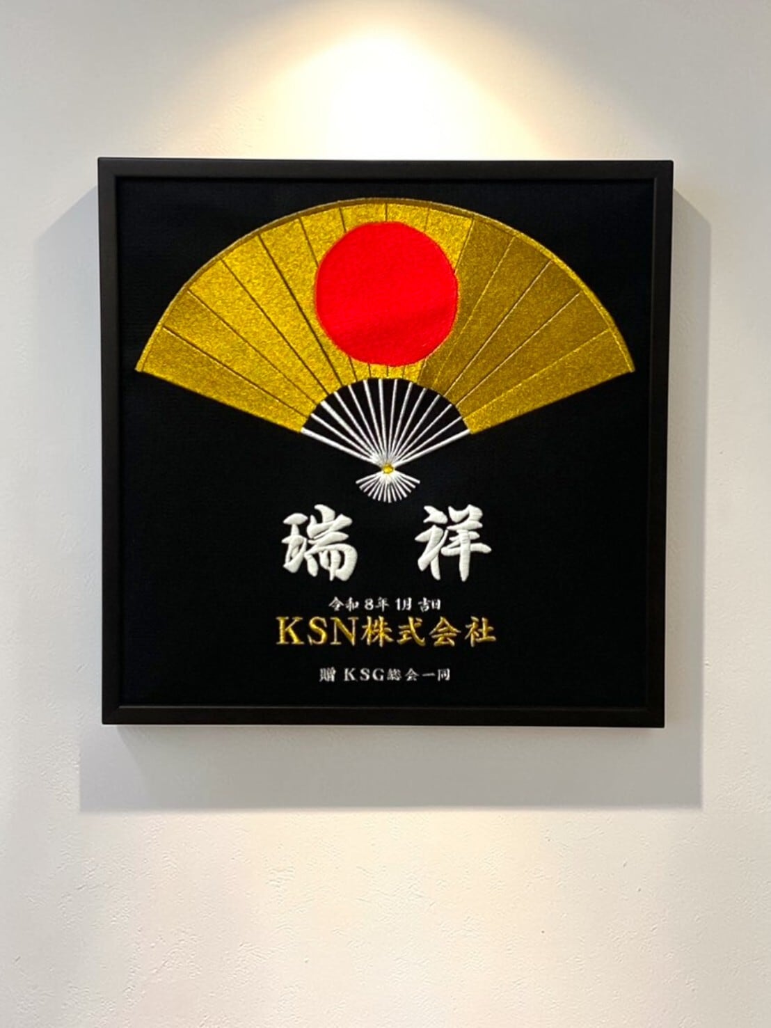(特大)金扇子に赤丸:戦国大大名も馬印に使う縁起物。 壁掛け出来るので邪魔にならず贈物としても大人気! ★瑞祥【ずいしょう】とは ・瑞(めでた)いことの起こる前兆。吉兆のこと。 ■文字はお好きな言葉をお入れ可能です。 全4行 上から ・大文字、一行 ※瑞祥 ※蓄光も可能 ・年月日 ・中文字 一行 ※KSN株式会社 ・小文字 一行 ※贈 KSG総会一同 □サイズ:36㎝×36㎝×厚み1.5㎝ □制作発送期間:2~4日間、混雑状況により変わります。 ※お急ぎの場合は、備考欄にご記入くださいませ。 【こんな場面に選ばれています】----------------------------------- (開業記念・一周~十周年記念・合格祈願・安全祈願・還暦祝い・金婚祝い・新築祝い) 【人気の言葉】------------------------------------------------ 【金運上昇】【事業反映】【社運隆盛】【本願成就】【社内安全】【交通安全】【福】 【必勝】【家内安全】【家族円満】【無病息災】【交通安全】【病気平癒】【本命元辰】 【健康祈願】【開運吉祥】【受験合格】【身体健勝】【学業成就】【大願成就】 【五穀豊壌】【家運隆盛】【笑門来福】【合格】【感謝】【ありがとう】【全国制覇】 ★お家、事務所、店舗、部活動、勉強部屋、書斎など 今期の目標や祈願などを、(金の扇子)と一緒に刺繍し 目に見える形で壁掛け出来るので邪魔にもならず モチベーションの向上にも最適です! ============================ 「金の扇に赤丸」は、日本の伝統意匠は最強におめでたい品です。 意味を分解すると、より運気を高める事が出来ると思います。 ■金(きん) ・富・繁栄・成功 ・邪気を払う色 ・ 七五三や祝い旗、家紋風デザインによく使われます。 ■扇(扇子) ・形が末広がり ・ 子孫繁栄・運気上昇・将来が開ける ■平安時代から吉祥文様 ・赤丸 ・太陽(=日・命・中心) ■日本では「魔除け」「生命力」「祝福」の色 ・金地に赤は特に格式が高い祝い配色 最高の贈物、自社の壁に掛けても 縁起の良さは、毎日のように目から伝わります。