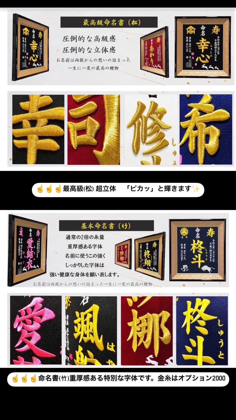 Instagramオーダー(ゆりな 様)専用 ・基本命名書(竹) ¥14,890- ・生地カラー:黒 ¥0- ・糸カラー:ピンク ¥0- ・右下にハート(大)オプション ¥870- ・全体に桜の花びらオプション ¥1,000- ・金色の額縁 ¥0- =============================== 計 ¥16,760-