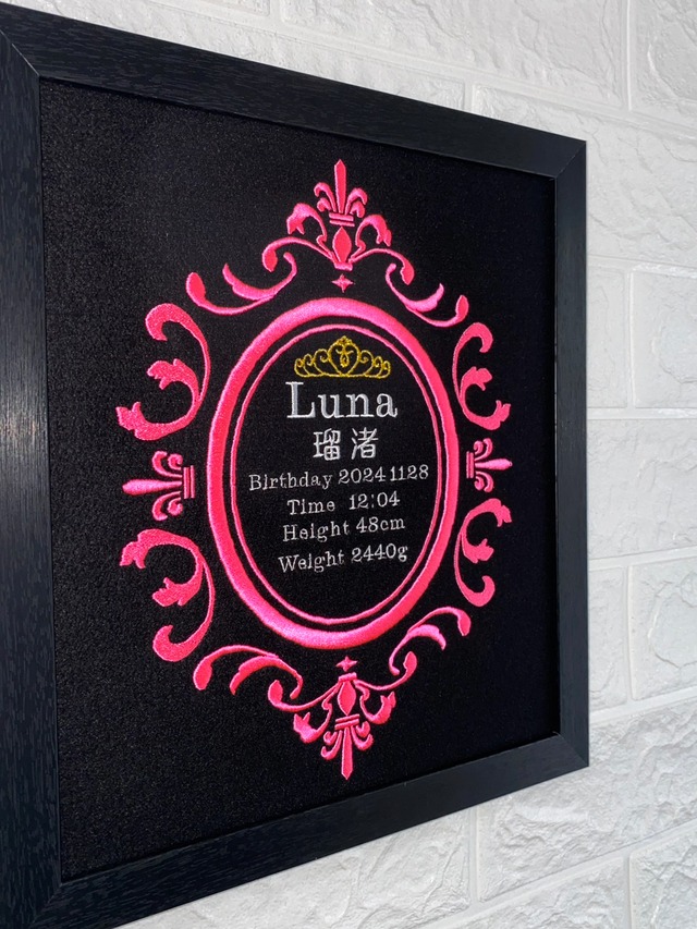 □ヨーロピアンデザイン ・黒生地 ・ピンク糸 ・ティアラ ※金糸 ・白文字 ・額縁付き(ブラック・ホワイト・ナチュラル) ーーーーーーーーーーーーーーーーーーー 1、スペルの御名前 2、漢字の御名前 3、生年月日 4、出生時間 5、身長 6、体重 以上の内容が刺繍できます。 ーーーーーーーーーーーーーーーーーーー (サイズ)縦33㎜×横27.2㎜×幅10㎜ ・横にも縦にも壁掛け可能 ・壁掛けも、立てる事も可能 ・紐付き ・PET素材の面材入り ーーーーーーーーーーーーーーーーーー (ご注文後の流れ) 1,ご注文の確定 2,イメージ画像の作成 3,内容のご確認 ※要ご返信 ご入力いただきましたメールアドレス宛に お送りいたします。 4,制作開始 ※2~3日程度 5,発送→到着 ※千葉県市川市より ★ー★ー★ー★ー★ー★ー★ー★ー★ その他、ご不明点等ございましたら お気軽にご連絡くださいませ。 ★ー★ー★ー★ー★ー★ー★ー★ー★ お子様にとって一生の宝物 【Lapin刺繍】------------ お名前は両親からの 想いを込めた一生に一度の 最高の贈り物!! -------------------------------------- (問合せ:返答時間) 午前9時~午後16時30分 ※ご注文/お問合せは24時間受付中